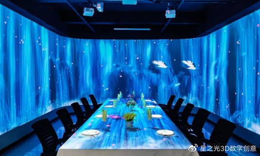 全息餐廳分為全息餐廳包間和全息餐廳大廳,其中,包間內(nèi)可運(yùn)用全息投影技術(shù),打造墻面、桌面投影。