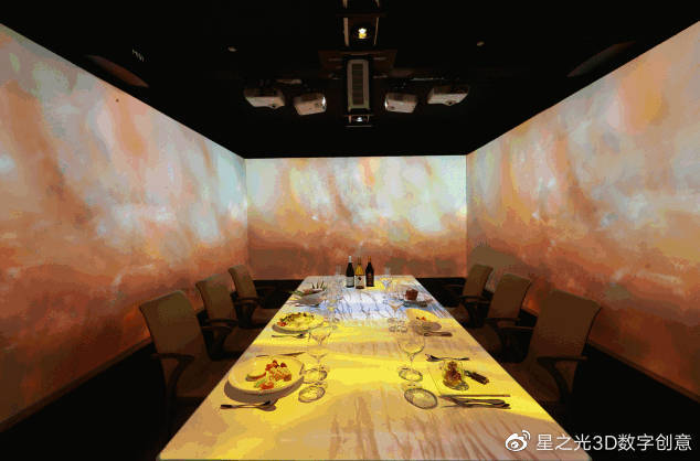 全息餐廳多個(gè)題材的場(chǎng)景切換,不需要太高的技術(shù)含量,可以用白色的墻壁投影,不用做太多的裝飾,也可以用圓桌、方桌、長(cháng)桌等多種形式進(jìn)行投影。