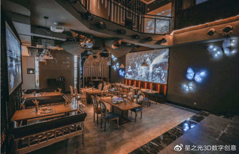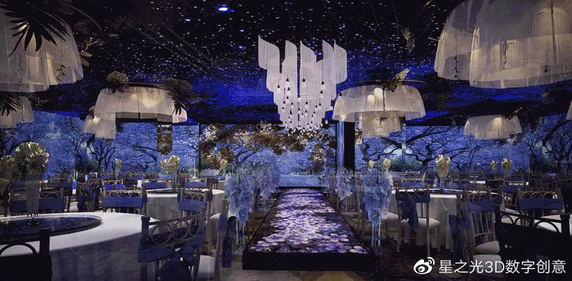 傳統的宴會(huì )廳,大多采用投影技術(shù),但效果并不理想,而新型的宴會(huì )廳,則是將5 D光影技術(shù)投射到墻壁上,讓賓客身臨其境,宛如置身于一幅畫(huà)卷之中。
