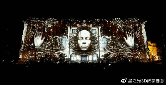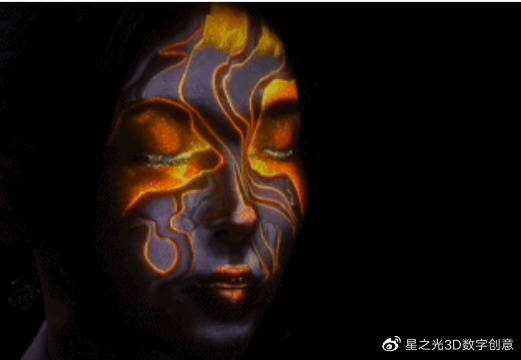 利用3D動(dòng)畫(huà)技術(shù),產(chǎn)生臉部藝術(shù)效果,再將其投影到人的臉部,從而構成“影像面具”,從海洋、海豚到面具碎片,都是非常精細的。